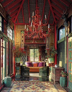 The furniture is what they call "Hollywood Regency" to me. It has an emphasis on antiquing and rich fabrics. Tony Duquette ( http://en.wikipedia.org/wiki/Tony_Duquette ) perhaps?